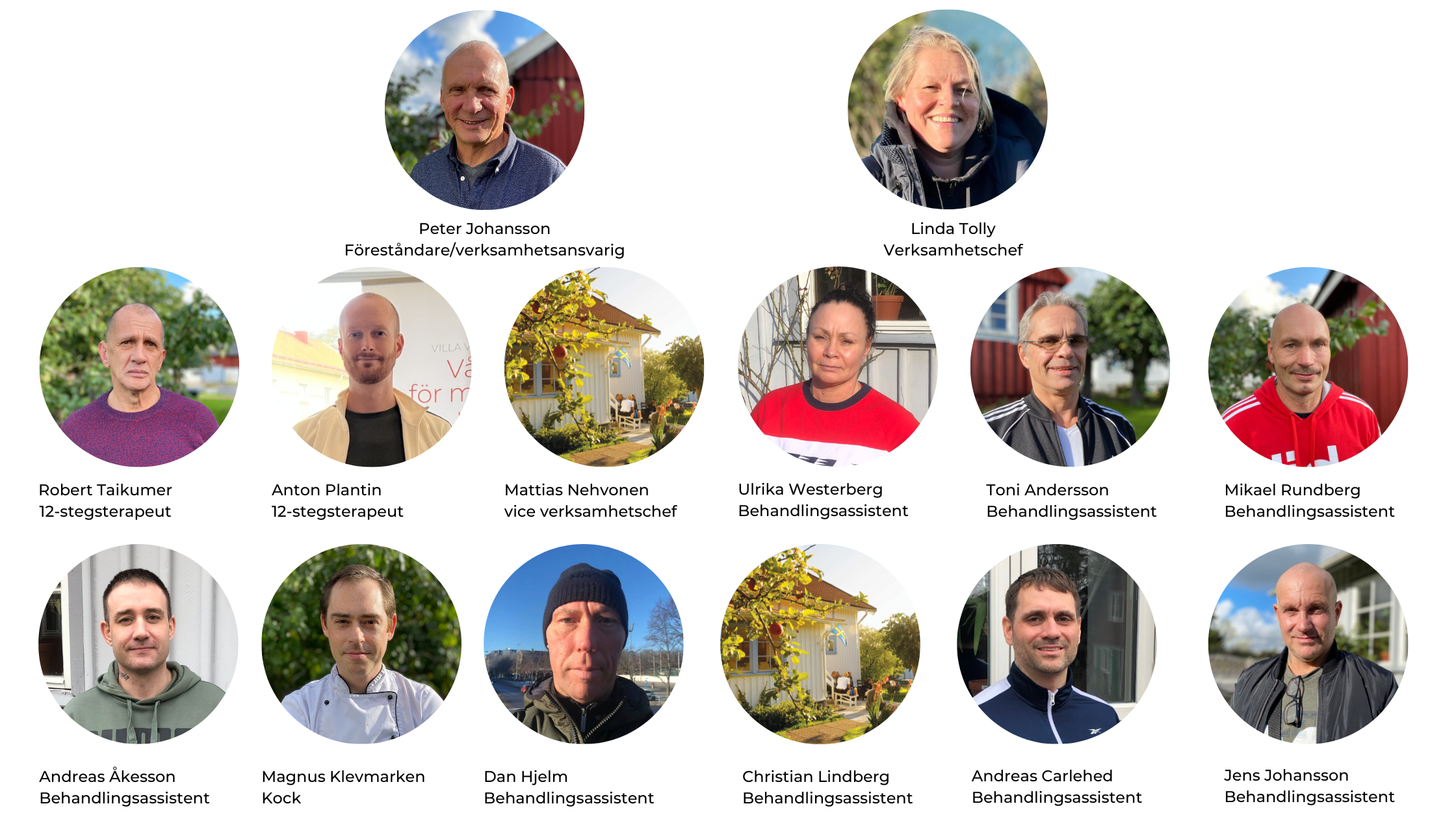 På våra villor arbetar behandlingsassistenter, beroendeterapeuter och socionomer. Alla har egen erfarenhet av att ha lämnat missbruk och kriminalitet, är aktiva inom tolvstegsprogrammet och fortbildas löpande. Vi har HVB-tillstånd och upphandlingsavtal, så kallat ramavtal, med kommuner och Kriminalvården.